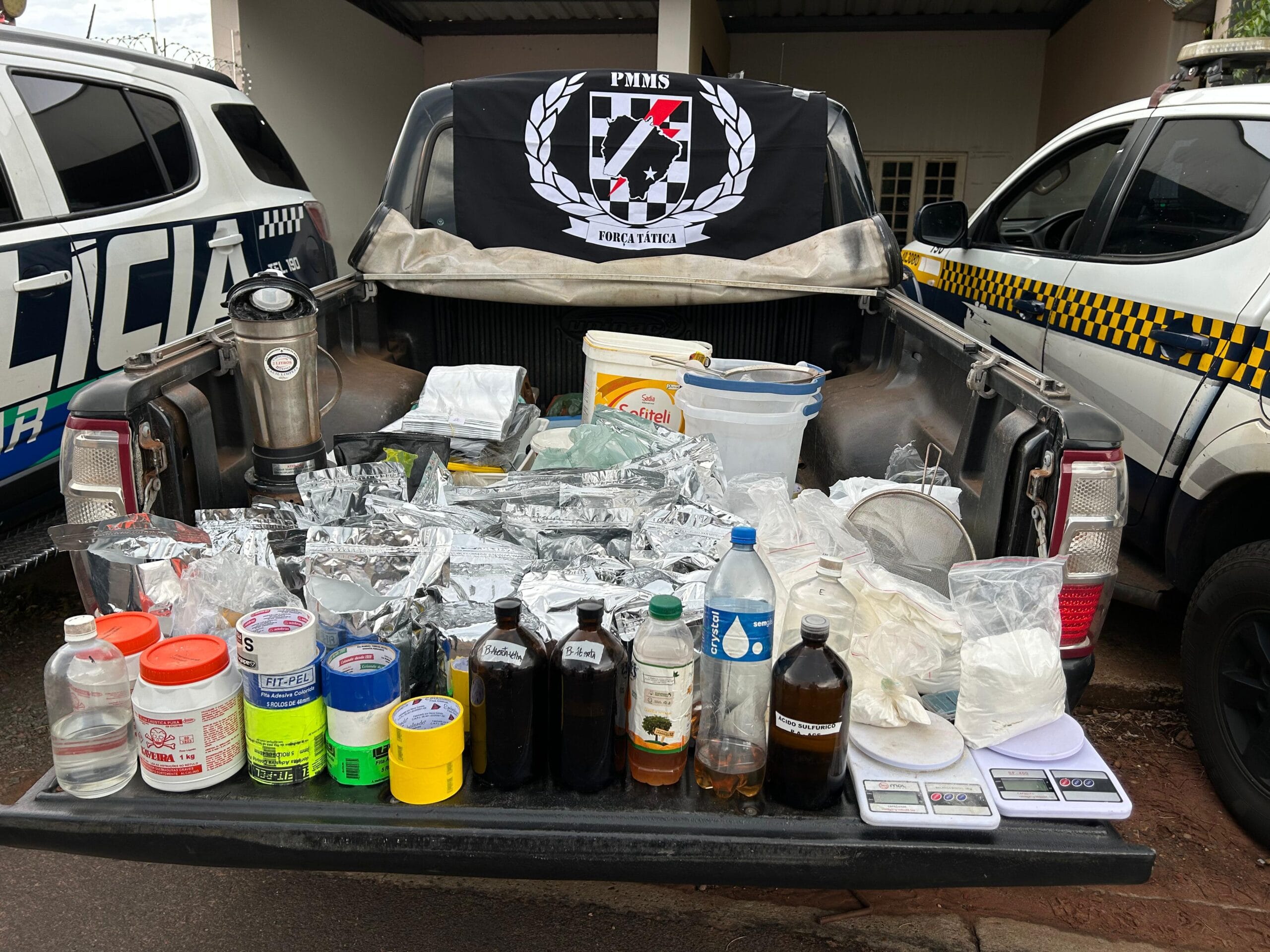 No interior do imóvel, situado também em área residencial do bairro, os militares se depararam com ambiente adaptado como verdadeiro centro de processamento de drogas. Havia mesas de manipulação, equipamentos industriais e insumos químicos diversos, configurando estrutura voltada ao preparo em larga escala do entorpecente.